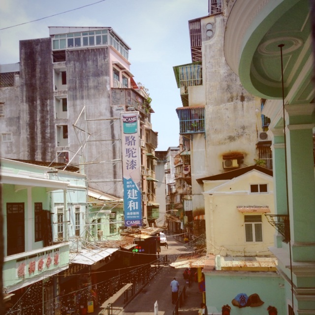 打ちっぱなしのコンクリートと色鮮やかな建物の対比
