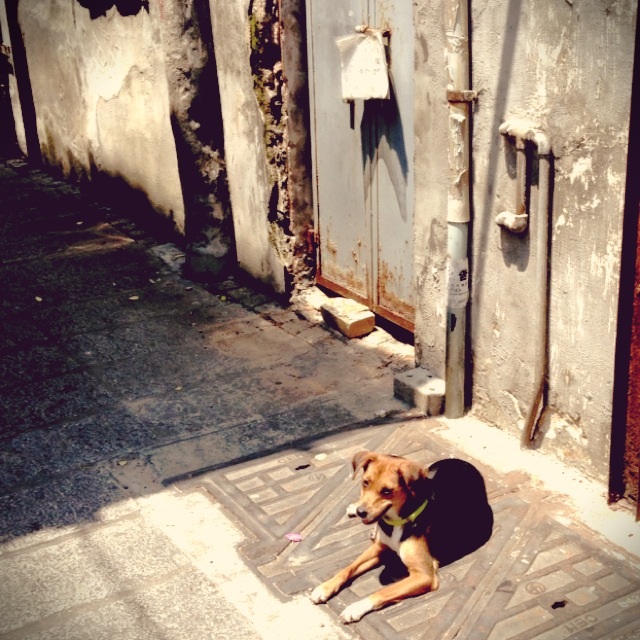 裏路地のわん マンホール上でおなか熱そうなのに良い子の伏せ