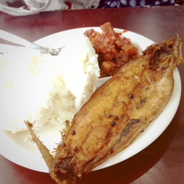 おひる ミルフィッシュ?のフライとポークの甘辛煮 どっちもスパイシー