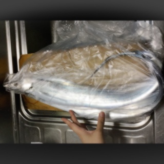 上司が釣ってきたタチウオもらったけど大きすぎて捌くのえらい大変だったしアゴで手を切ってしまったわい