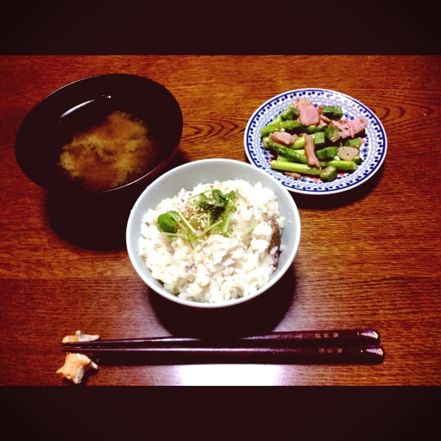 鯛めしリベンジ〜〜今日は焦げずにたけたぞ と、茄子のおつゆとアスパラベーコン