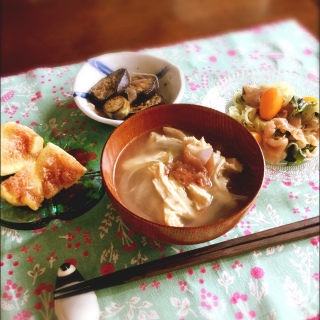 朝ごはん、鶏むねと梅のさっぱりスープ・オニオンメインの生ハムサラダ・なすマリネにおうちのいちじく〜〜残りものだけどごうかごうか