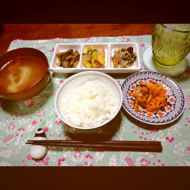 ビャビャッと出来たー 茄子油みそ・ジャーマンポテト・春雨炊いたん・人参の酢のものに、トマトと鳥のコンソメスープでドン