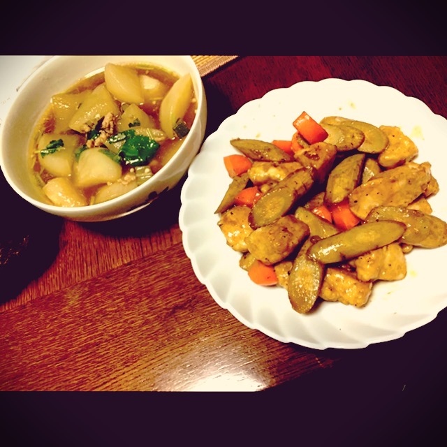 今日のごはん 鳥むねと根菜の甘酢炒めとカブのひき肉あんかけ ぉぃしぃ
