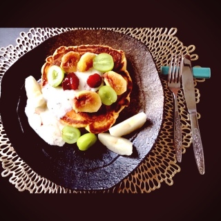 フルーツもりもりパンケーキ〜 おもち入れたのちゃんと膨らんだわよ(^.^) ホホ…