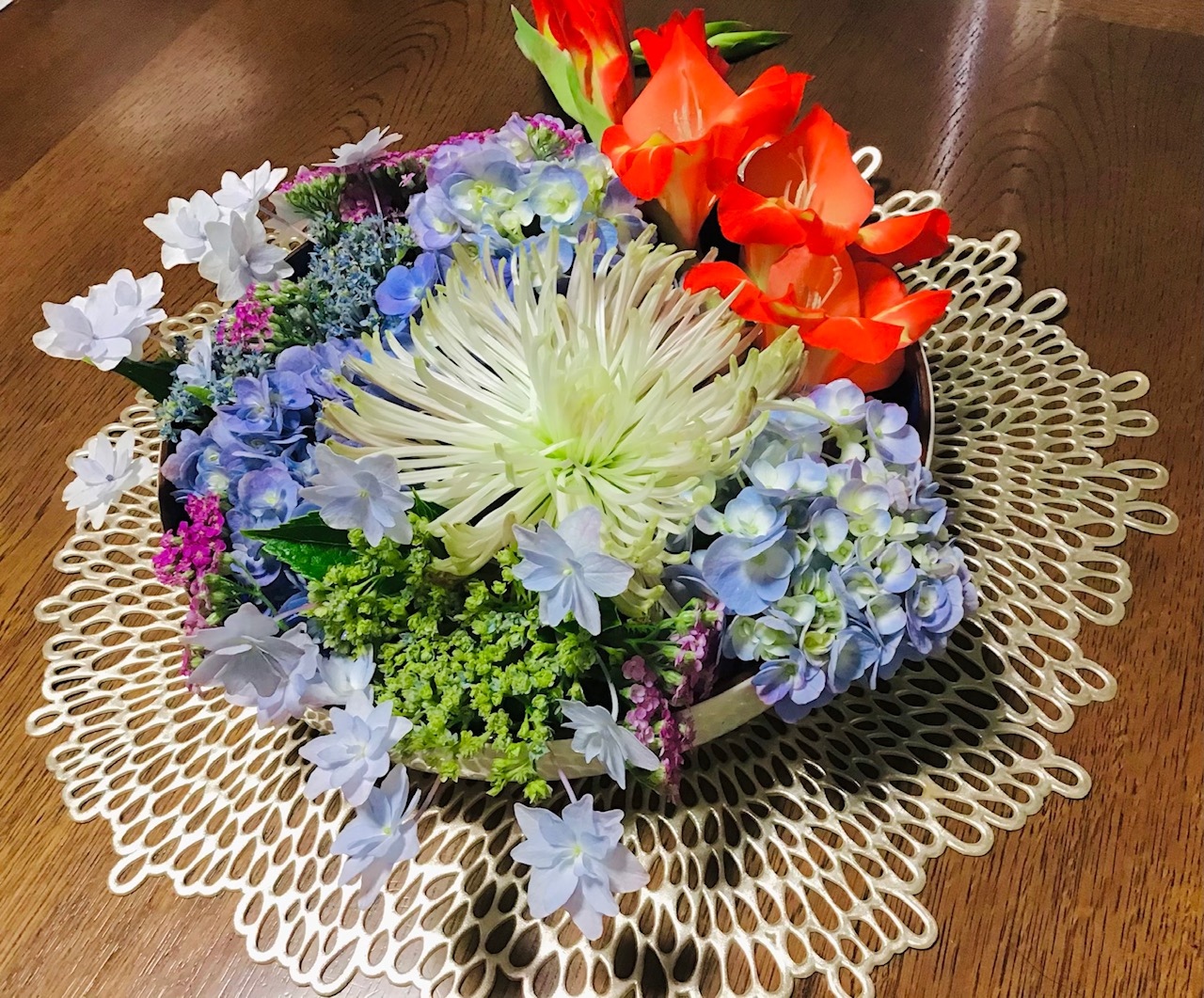 菊が終わりかけなので庭の花とあわせて花手水みたいに飾ってみた